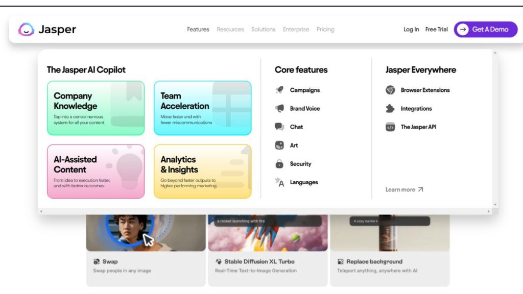 Jasper began as an AI specialized in writing but has expanded to include image generation capabilities after acquiring Clipdrop. It positions itself as a productivity tool for marketers seeking various content outputs.