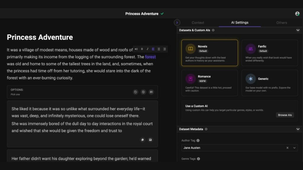 NovelAI breaks away from generic AI writing, giving experienced storytellers the flexibility to fully customize output, genre, and even authorial voice.